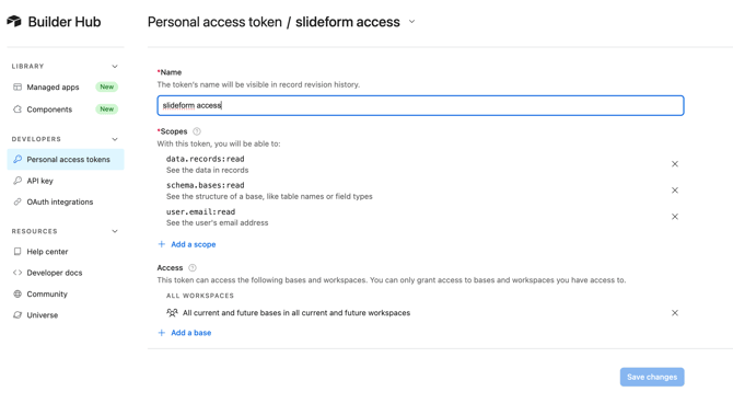 To connect your Airtable account to Slideform, you will need to create a personal access token. See the Airtable Personal Access Tokens for more information.