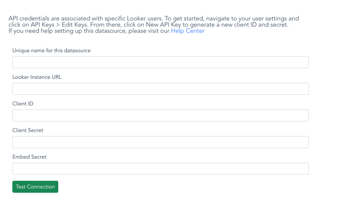 - On the next page, you will enter a name for the data source, the Looker dashboard instance URL, the client ID, and client secret.
