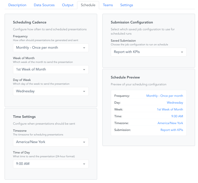 Learn how to schedule a presentation to be auto-generated on a recurring basis. Receive an email notification with a link to the presentation output.